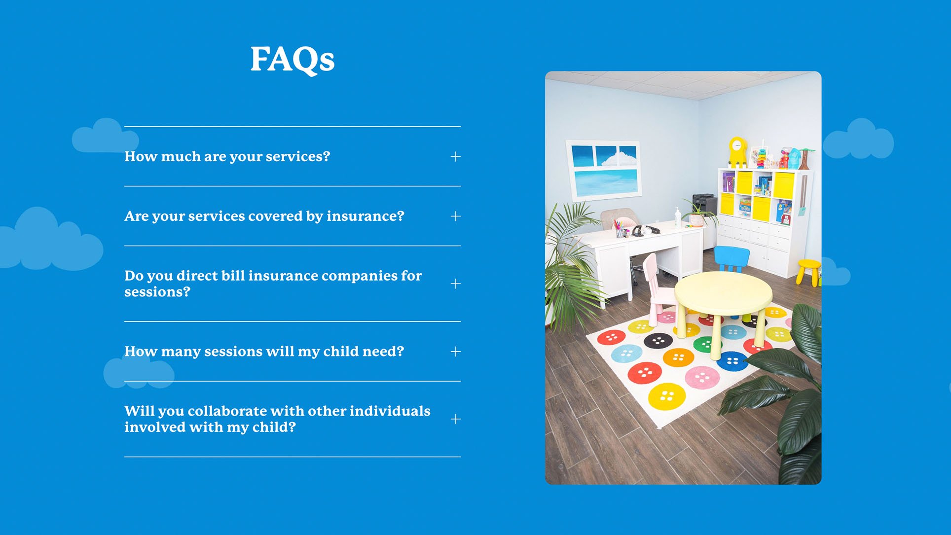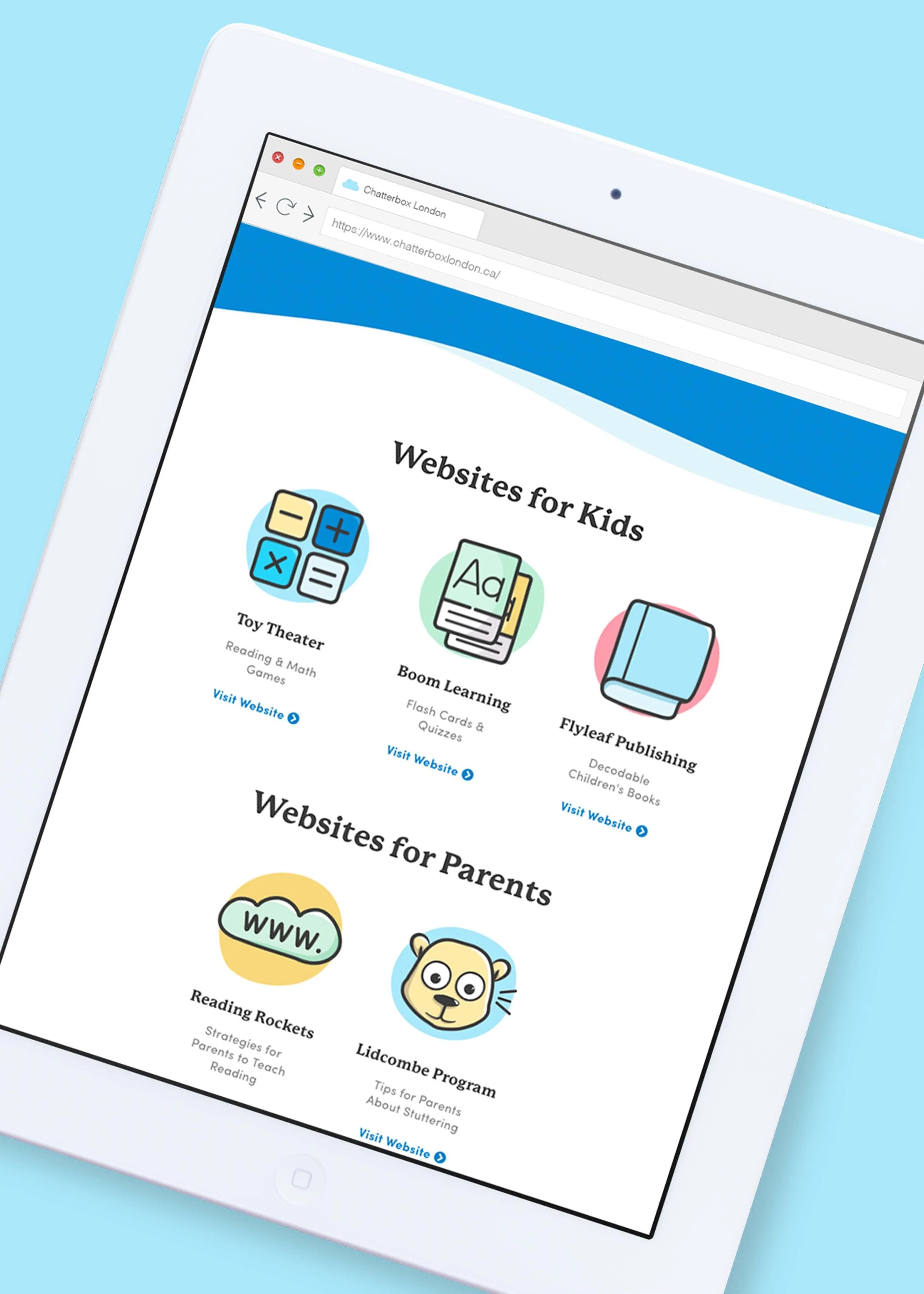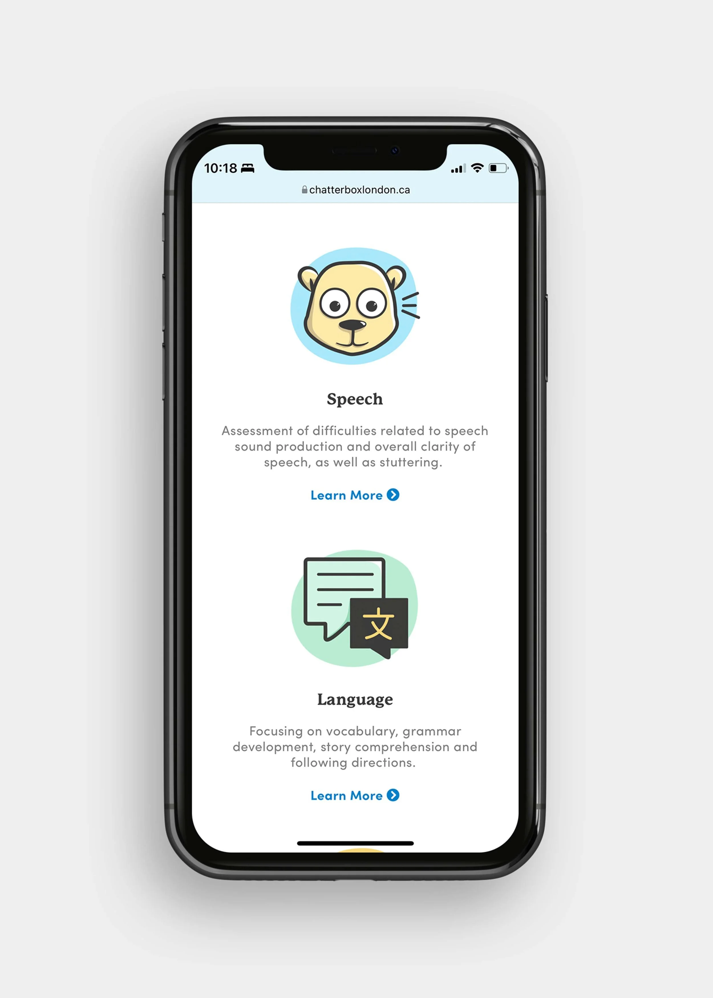 In addition, I designed a fun website and social media graphics that matched this tone. The website’s imagery features happy kids and the same friendly colour palette, fun custom icons, and simple shapes throughout. Below is a preview of the website design which integrates the benefits of speech therapy and the unique approaches that Chatterbox uses.