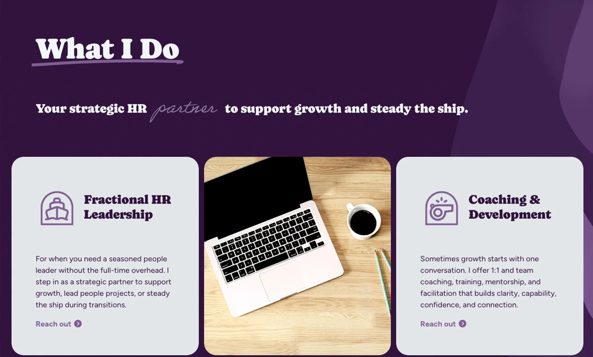 The website needed to clearly outline her services; fractional HR leadership, HR consulting, and coaching, in a user-friendly layout that would support her growth.