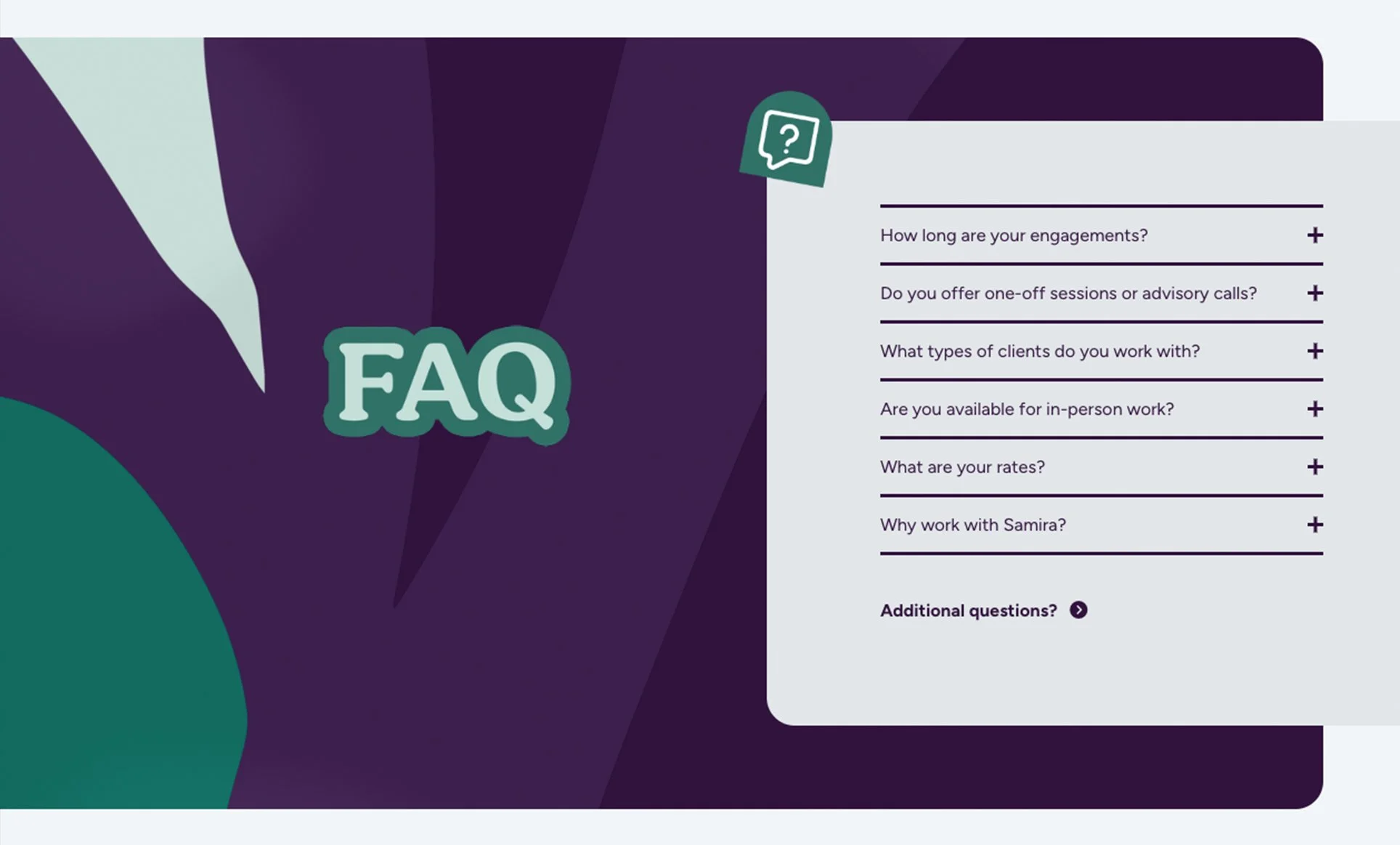 Every element, from the color palette to the typography, was chosen to support Samira’s goals and brand direction.