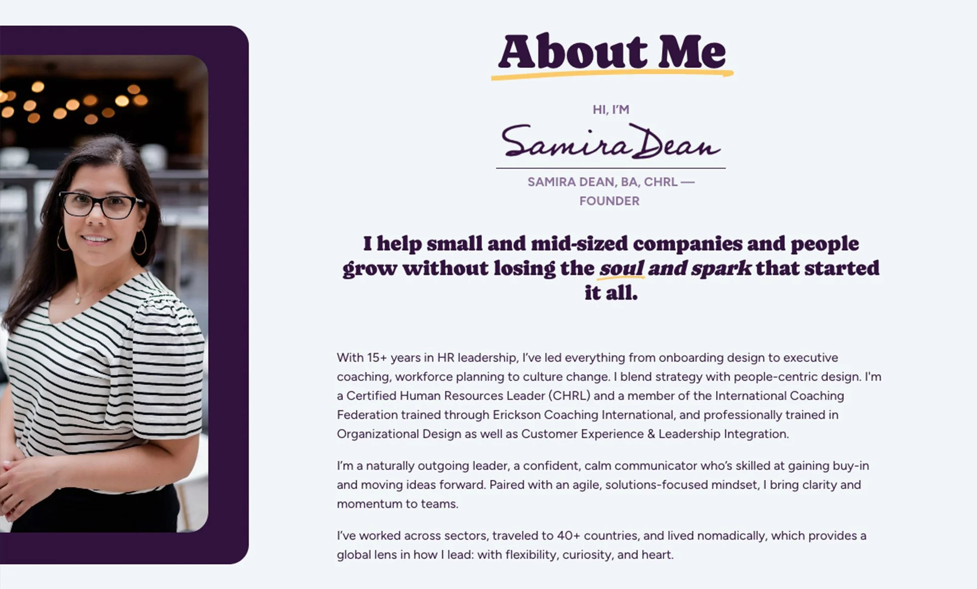 The website was designed to position The Soul & Strategy Co. as a reliable HR partner for organizations across Ontario, while maintaining the personal, human tone that sets Samira apart.