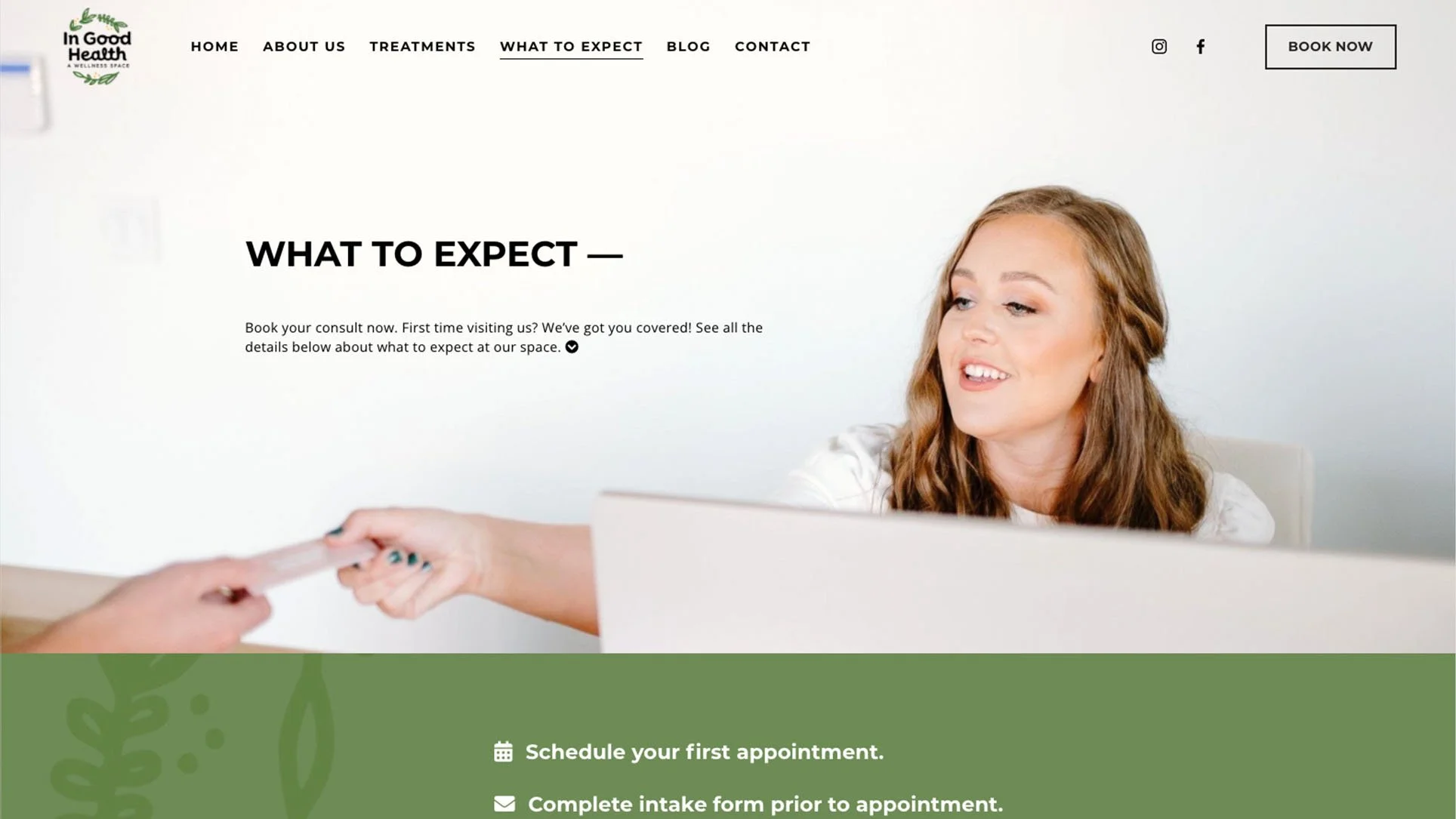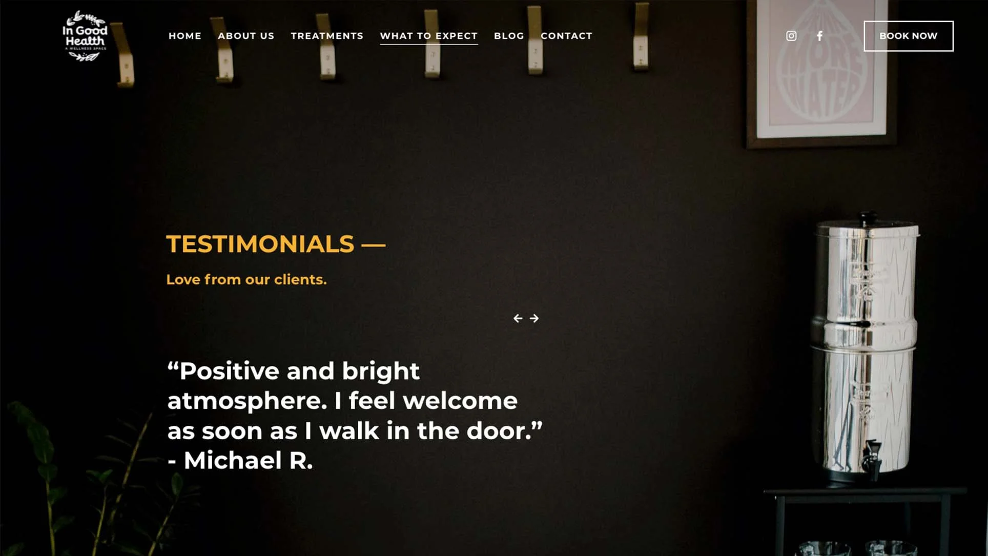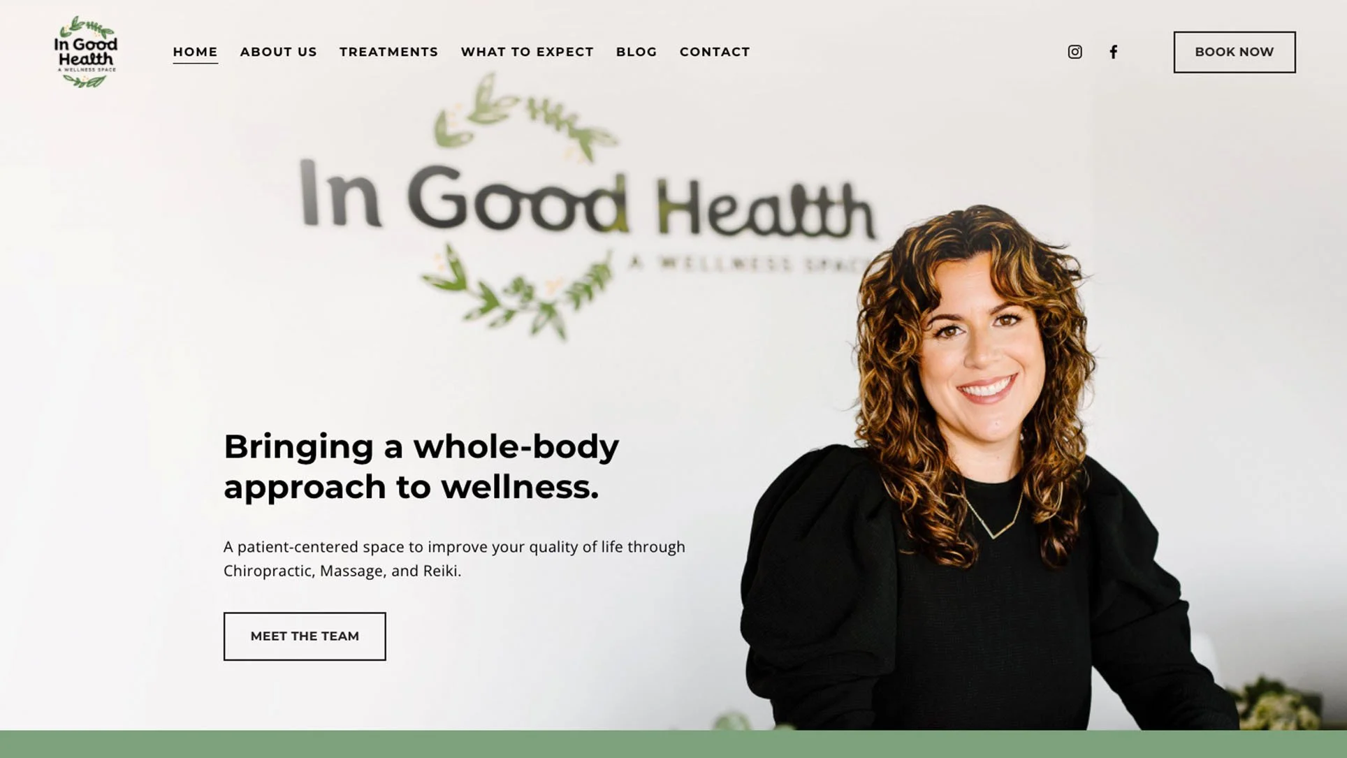 In Good Health was looking for web design that was clean, modern, approachable, but a bit bold, with a touch of earthy. I wanted to emphasize what stands out about this all-encompassing wellness space through specific placement of the written copy.