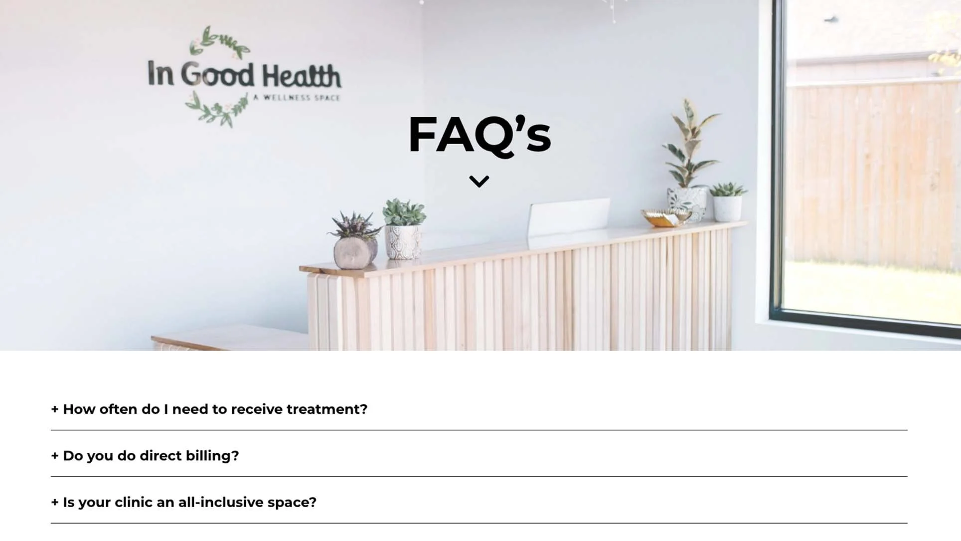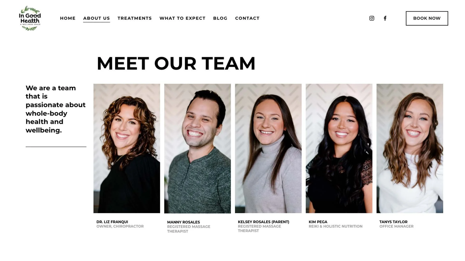 The In Good Health website allows users to easily access treatment information, view the team, and access the online booking system through Jane. The many beautiful photographs of these stunning ladies (and gents) are by the very talented Thistle and Rose Photography. A web design truly shines with professional photography.
