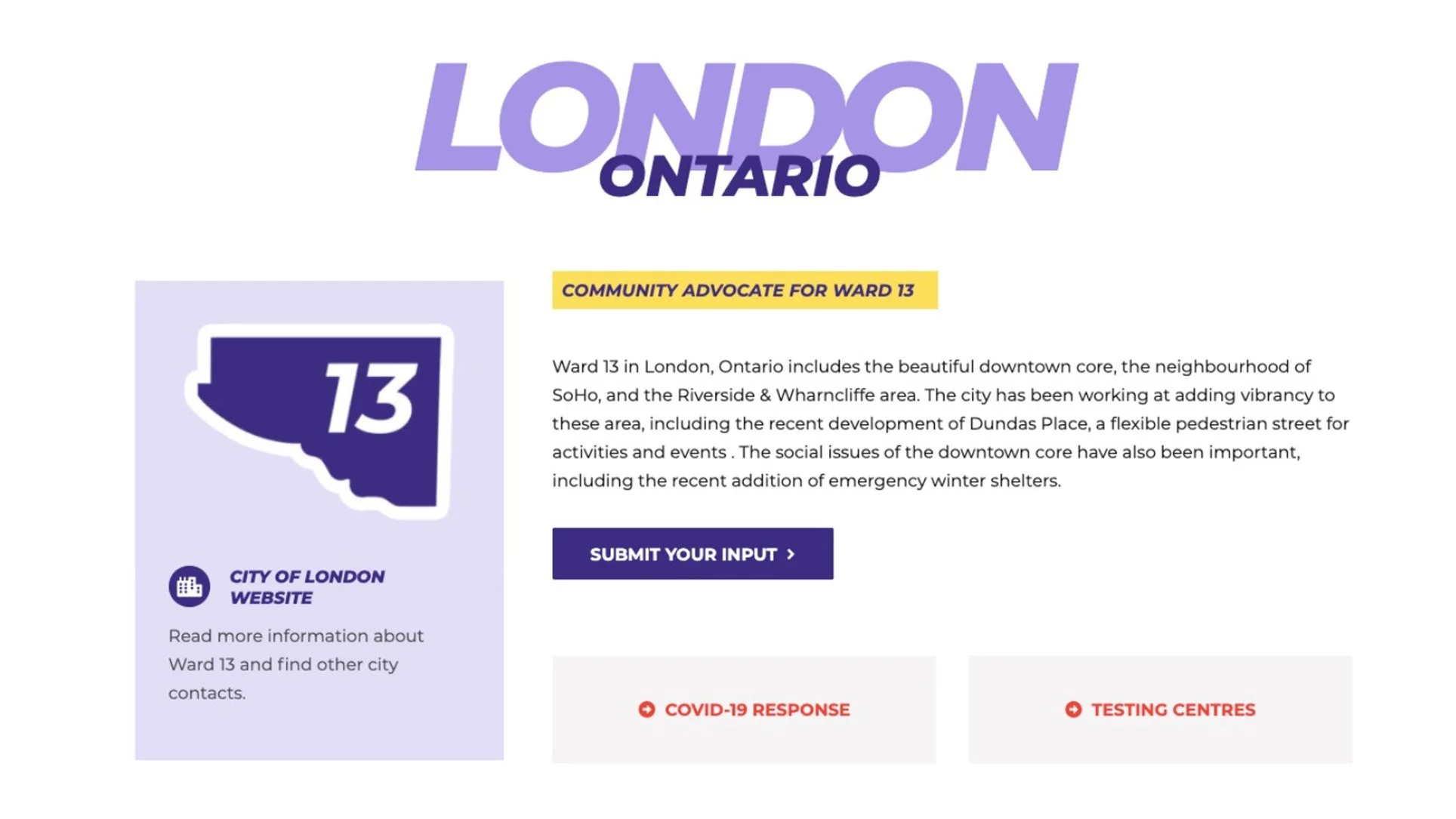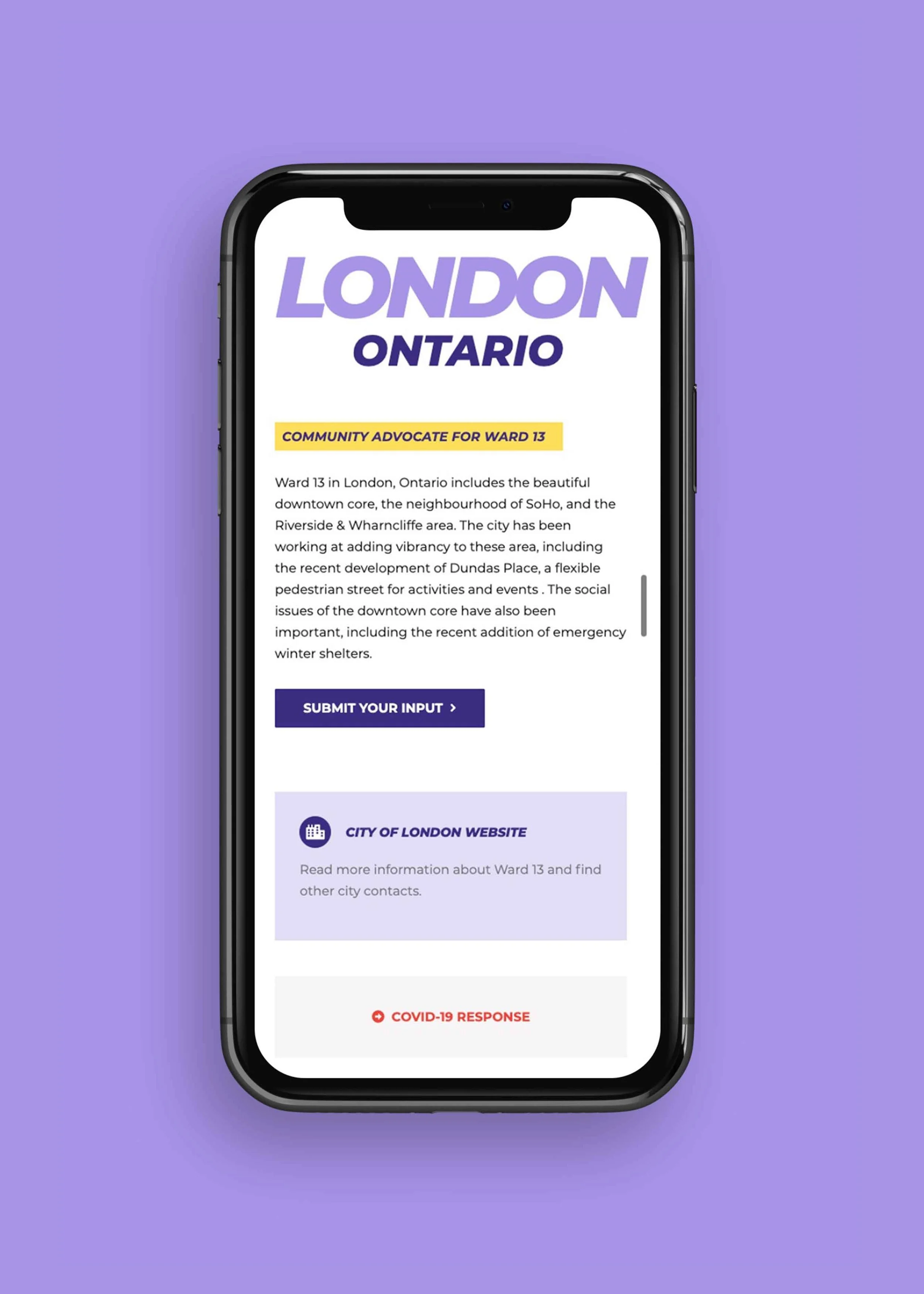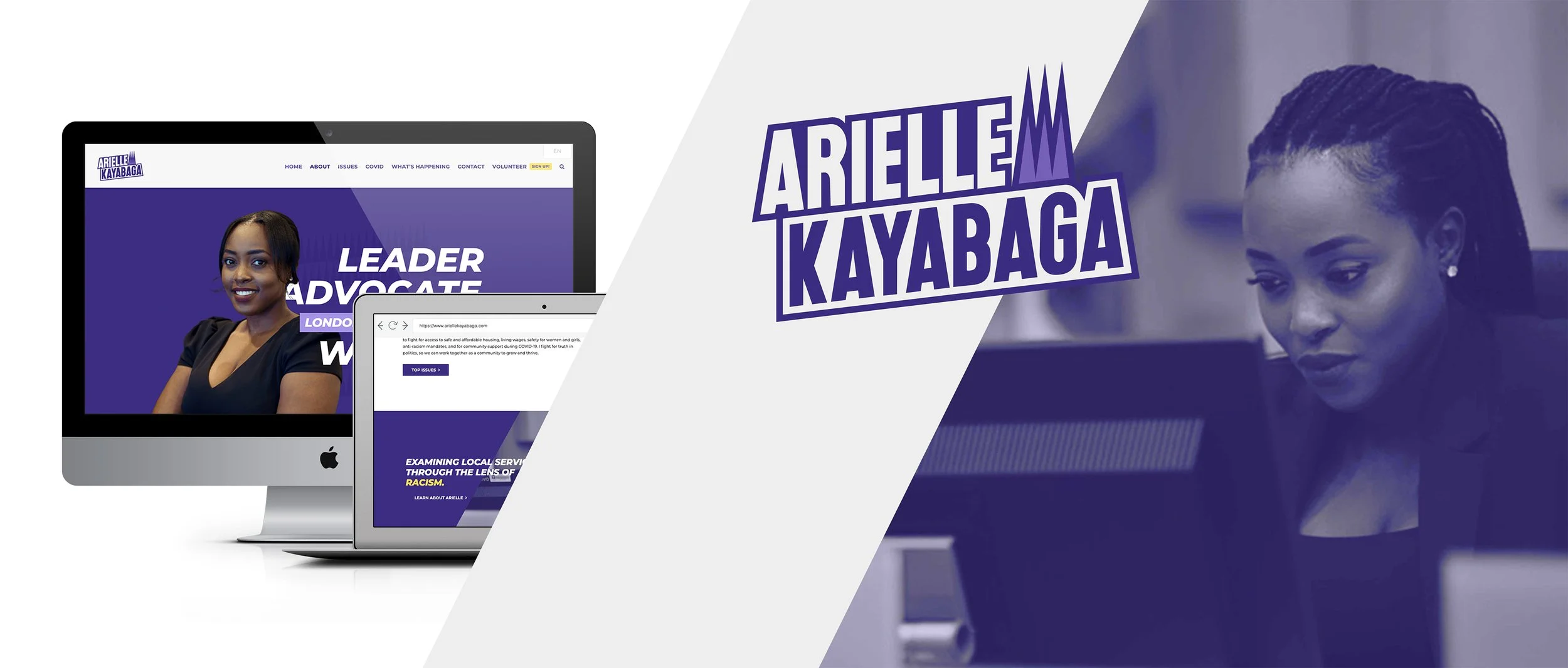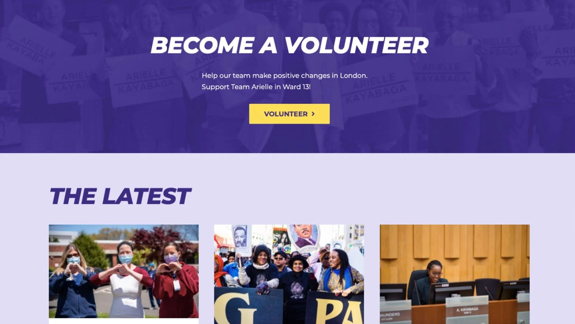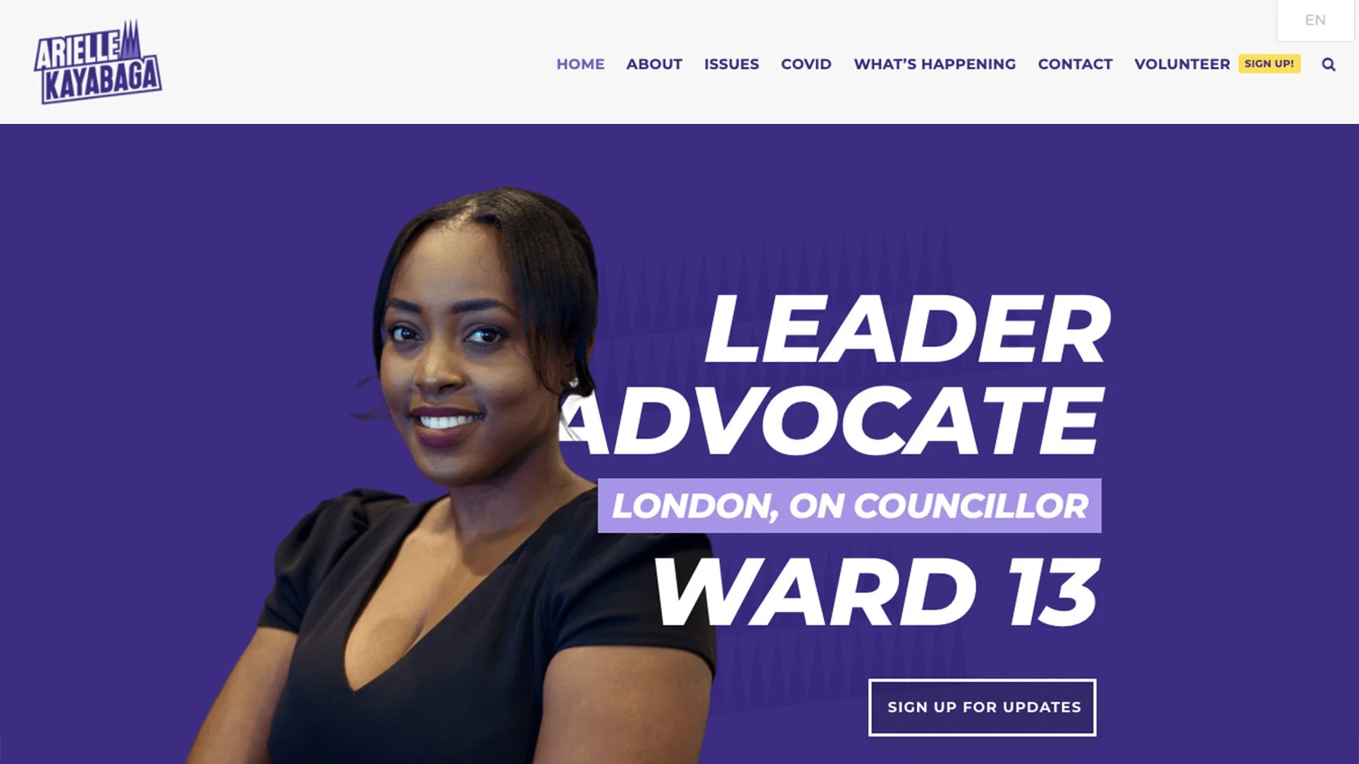 Below is a preview of the campaign website, designed to clearly communicate Arielle’s platform, values, and dedication to London’s Ward 13 community. The site features an accessible layout that highlights her key commitments, shares local updates, and connects visitors to upcoming events and volunteer opportunities. A dynamic blog feed keeps supporters informed and engaged, while bold typography and the purple-and-yellow palette reinforce the campaign’s confident, forward-thinking identity. Together, these design elements create a cohesive online presence that’s both professional and approachable.