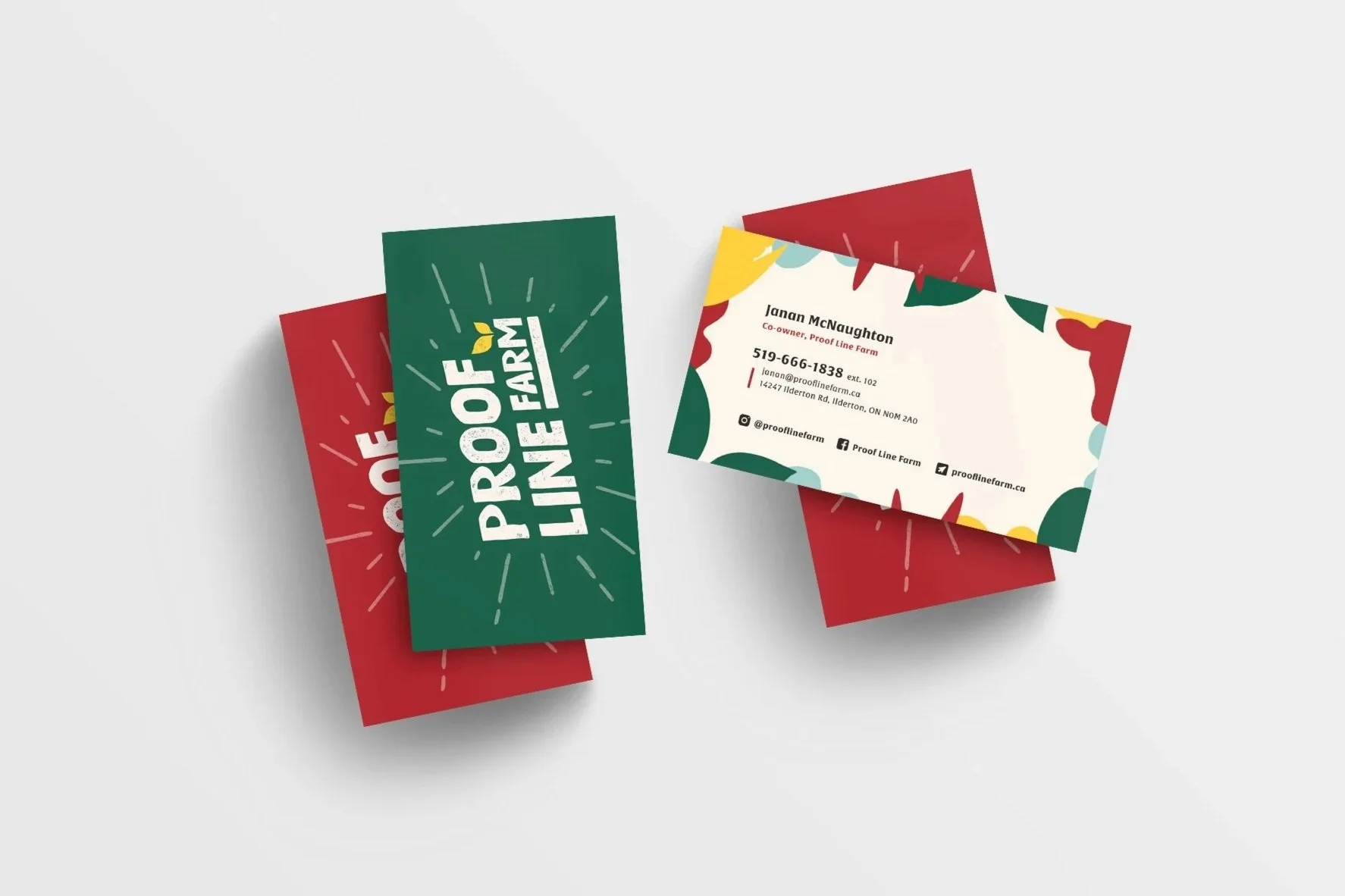 After choosing the logo direction, we also finalized the colour palette and other details of the brand’s visual identity, developing icons, patterns, textures, and supporting fonts. The bold colour palette makes the brand feel strong and established, with hints of brighter yellow for a fun, welcoming vibe. It really all comes together to showcase Proof Line Farm as a forward-thinking, approachable family farm. I have included examples of business card designs and social media banners.