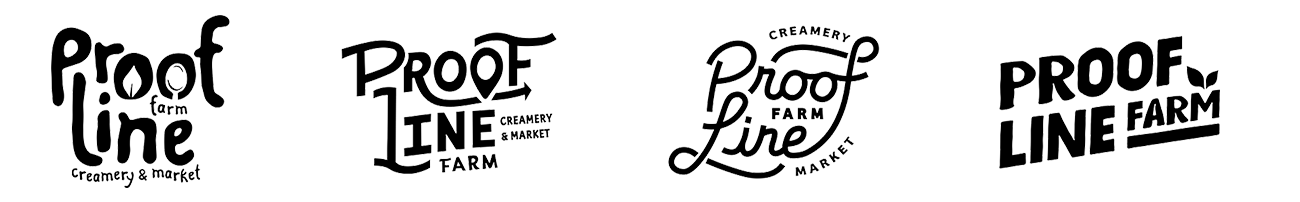 Below, I’ve included the beginnings of the farm logo design process. These are four rough logo concepts. I wanted to focus on the friendly, approachable vibe with lots of custom hand-drawn fonts. The first concept focuses on the “field to fork (spoon)” idea. The second emphasizes the forward route (arrow) and the location marker represents local. The third idea was a take on sustainability and regeneration (the infinity lines). The fourth is a clean, illustration-style typeface that focuses on growth with the sprout leaves. In this process, the fourth logo is the one that the Proof Line Farm wanted to further develop.