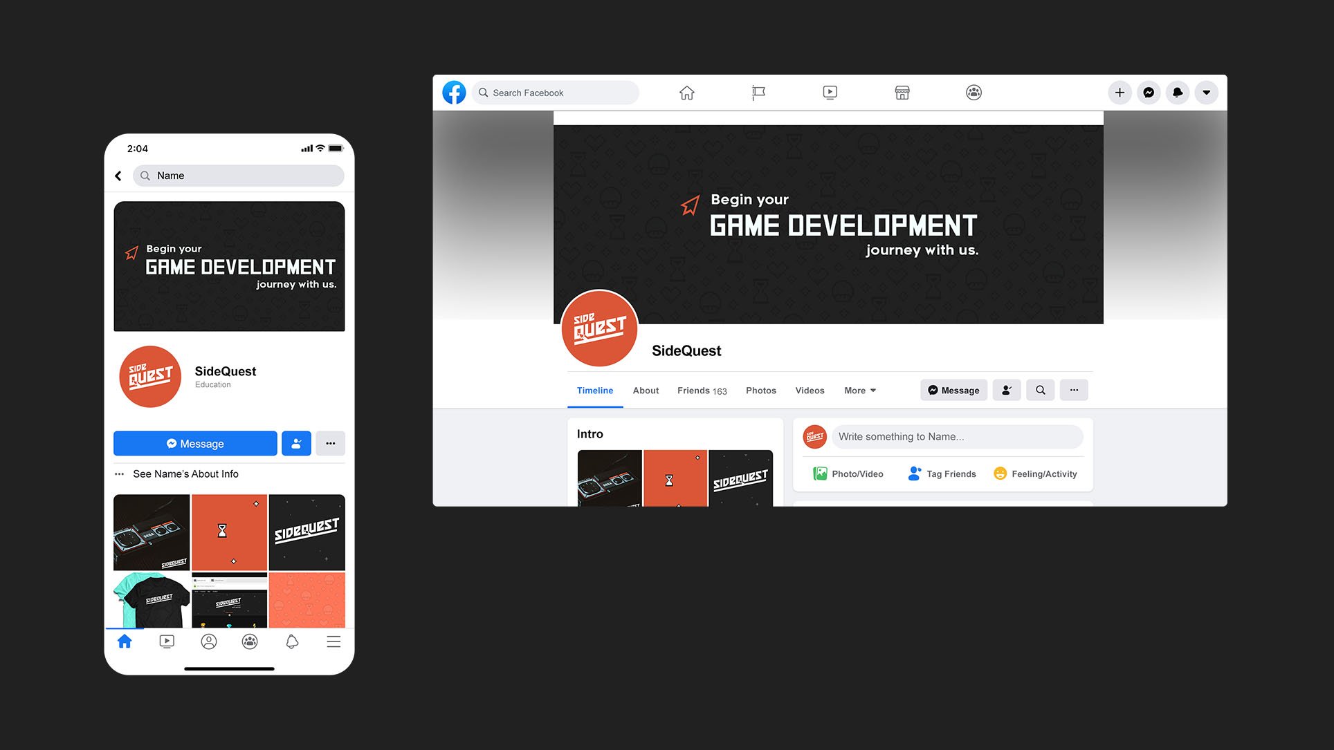 The dark color scheme is optimized for screen-friendly, nighttime viewing while giving a retro-modern gaming vibe. Additional brand assets, including initial social media graphics and business cards are below.